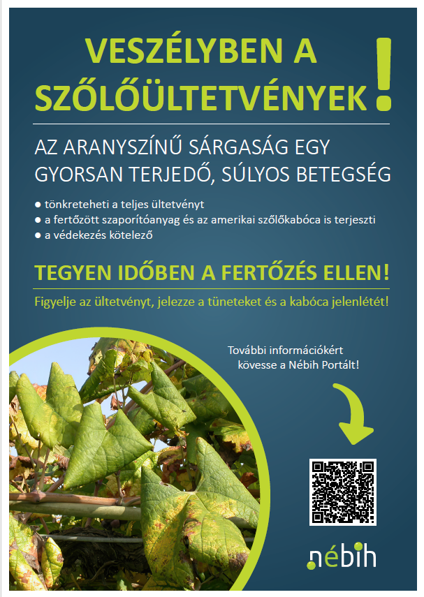 A Nemzeti Élelmiszerlánc-biztonsági Hivatal (Nébih) felhívja a szőlőtermesztők figyelmét a magyar borvidékeket súlyosan veszélyeztető szőlő aranyszínű sárgaság betegségre. A kórokozó az emberre nem veszélyes, ugyanakkor a szőlőtőkék terméshozamát akár 50%-kal csökkentheti, sőt egyes esetekben a teljes ültetvény pusztulásához is vezethet.